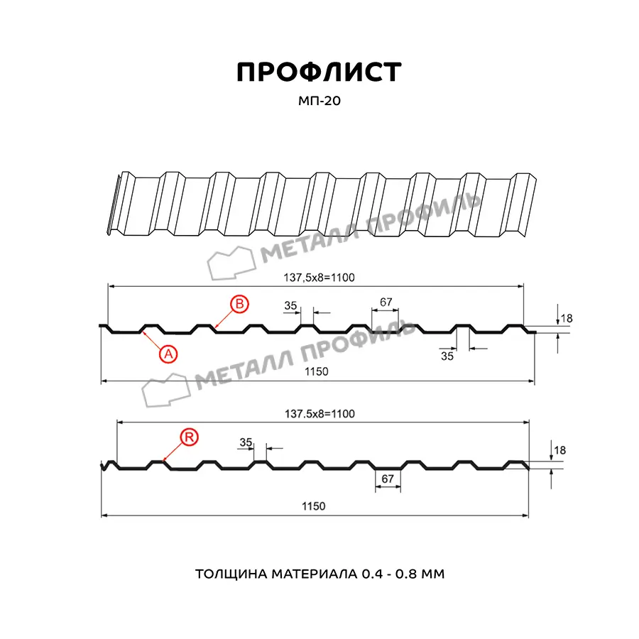 Профиль МП-20 является поистине многофункциональным стройматериалом. В сравнении с другими модификациями профлиста, этот изготавливается в трёх версиях: А, В и R. Типы А и В используются для кровельных работ, облицовки стен, монтажа заборов, для внутренней отделки складских зданий, гаражей, ангаров и т.п. Вариант с маркировкой R отличается наличием капиллярной канавки и предназначен для обустройства кровли. В зависимости от области применения, данный профлист выпускается из металлопроката толщиной от 0,4 до 0,8 мм. Важная деталь: несмотря на цифру 20 в названии, на самом деле глубина этого профнастила – 18 мм. Это материал бюджетной ценовой категории и имеет доступную стоимость. МП-20 – надёжный и качественный стройматериал, характеристики которого высоко оценивают не только частные домовладельцы, но и промышленные строители. Он отличается приличной жёсткостью, переносит значительные статические нагрузки и эффективно противостоит нагрузкам динамическим.